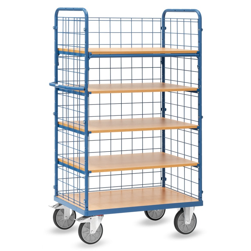 fetra Etagenwagen mit Drahtgitter 600 kg Tragkraft, 5 Etagen, 1800 mm hoch, mit 1 Längswand