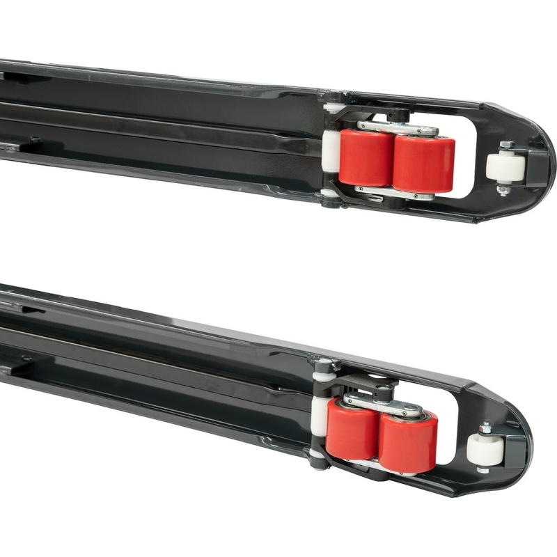 Hubwagen Profi-Ausführung für den täglichen Einsatz, robust und langlebig. Rahmen und Gabel in verwindungsfreier Schalenbauweise, Schmiernippel an den Drehpunkten, Schubstangen verstellbar, pulverbeschichtet anthrazitgrau RAL 7016, mit reflektierenden Logo-Aufklebern. Ein- und Ausfahrrollen an den Gabelspitzen. Aufschraubbare Hydraulikeinheit mit verchromtem Kolben, wartungsfrei gelagert. Ergonomische Stahlrohrdeichsel mit Gegenlager für Schubbetrieb, schwarz pulverbeschichtet, Griff gummiummantelt. Leicht dosierbarerer Einhand-Bedienhebel für die Funktionen Heben - Fahren - Senken. Lenkeinschlag 2 x 102,5 °