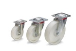 Gehäuse Stahlblech verzinkt. Räder mit Polyurethan-Bereifung, Alu-Felgen, Naben mit Kugellager. Leichter, geräuscharmer Lauf, beständig gegen viele aggressive Medien, hohe Lebensdauer