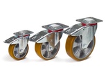 Feststeller „Doppelstopp“. Gehäuse Stahlblech verzinkt. Räder mit TPE-ESD-Bereifung (thermoplastisches Elastomer elektrisch leitfähig). Naben mit Präzisions-Rillenkugellager. Reifen nicht kreidend (spurlos). Schraubloch-Abstände 105/75 x 80 mm, Bauhöhe 237 mm, Schraubloch Ø 11 mm.